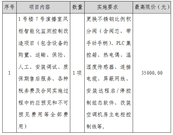 1、標(biāo)的名稱:1號樓7號演播室風(fēng)柜智能化監(jiān)測控制改造項(xiàng)目