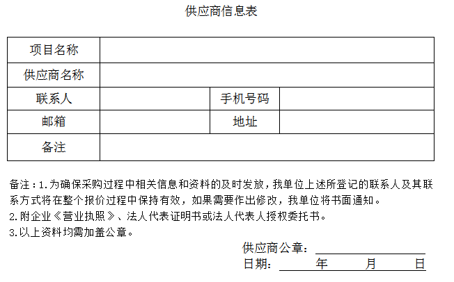 符合資格的供應商應當在2023年12月5日至2023年12月11日(上午09:00至11:30,下午14:30至17:30,北京時間,法定節(jié)假日除外),將填報后的公告附件內(nèi)容發(fā)送電子郵件并通知采購人,資料需采用WORD和PDF格式制作的電子版各壹份(其中PDF格式文件必須為簽字蓋章后的彩色掃描件)發(fā)至采購人郵箱:24808615@qq.com,郵件名稱命名為:項目名稱+供應商名稱。供應商所填報的聯(lián)系方式必須確保始終有效及聯(lián)系暢通,所填報的電子郵箱必須確保每天工作時間內(nèi)至少查看1次。