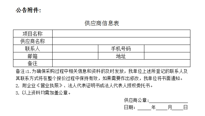 符合資格的供應(yīng)商應(yīng)當(dāng)在2024年09月10日至2024年09月14日(上午09:00至11:30,下午14:30至17:30,北京時間,法定節(jié)假日除外),將填報后的公告附件內(nèi)容發(fā)送電子郵件并通知采購人,資料需采用WORD和PDF格式制作的電子版各壹份(其中PDF格式文件必須為簽字蓋章后的彩色掃描件)發(fā)至采購人郵箱:24808615@qq.com,郵件名稱命名為:項(xiàng)目名稱+供應(yīng)商名稱。供應(yīng)商所填報的聯(lián)系方式必須確保始終有效及聯(lián)系暢通,所填報的電子郵箱必須確保每天工作時間內(nèi)至少查看1次。