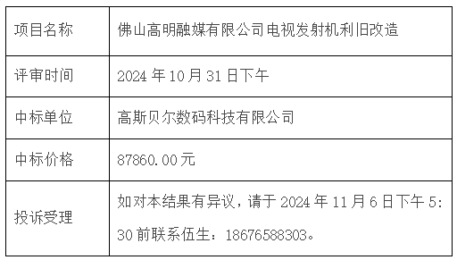 佛山高明融媒有限公司于2024年10月31日就電視發(fā)射機利舊改造項目進行了公開招標。經(jīng)過規(guī)范的招標、評標流程,現(xiàn)將中標結果公告如下: